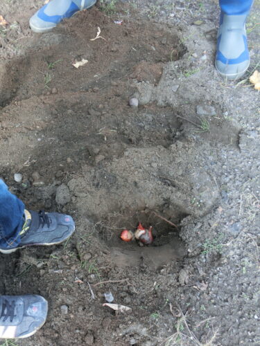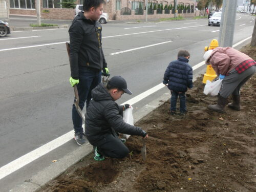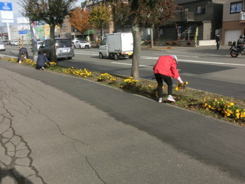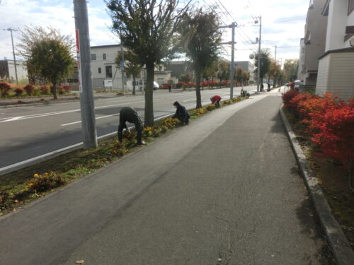 北野通り花壇では、役目を終えたマリーゴールド(今年は、例年に比べ生育が良好でした。)を撤去するとともに、会員から寄贈されたチュウリップの球根100株余りを補植しました。