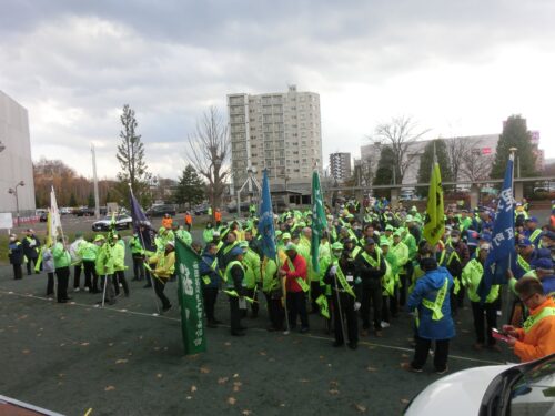 清田区長の代理の市民部長や豊平警察署交通官、清田町内会連合会代表の挨拶の後、参加者は区役所前の道道真駒内御料札幌線(厚別滝野公園通)に出て、「スピードダウン」などと書かれた旗を振って、走行するドライバーに安全運転を呼びかけました。
